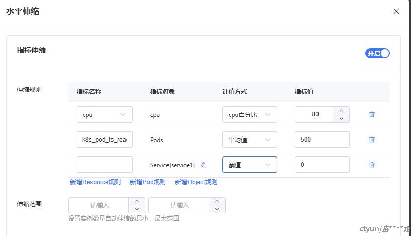 选择度量指标,支持两种类型:资源度量指标、自定义度量指标(Pod度量、Obeject度量)。