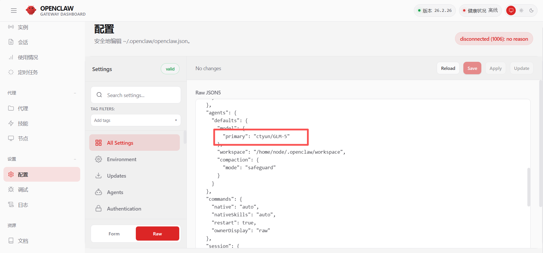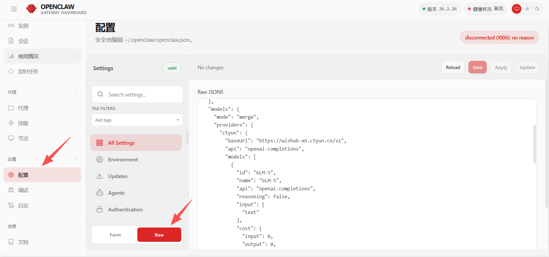 登录 OpenClaw的UI界面,在侧边栏中点击【配置】选项,将配置文件用 Raw形式展示。