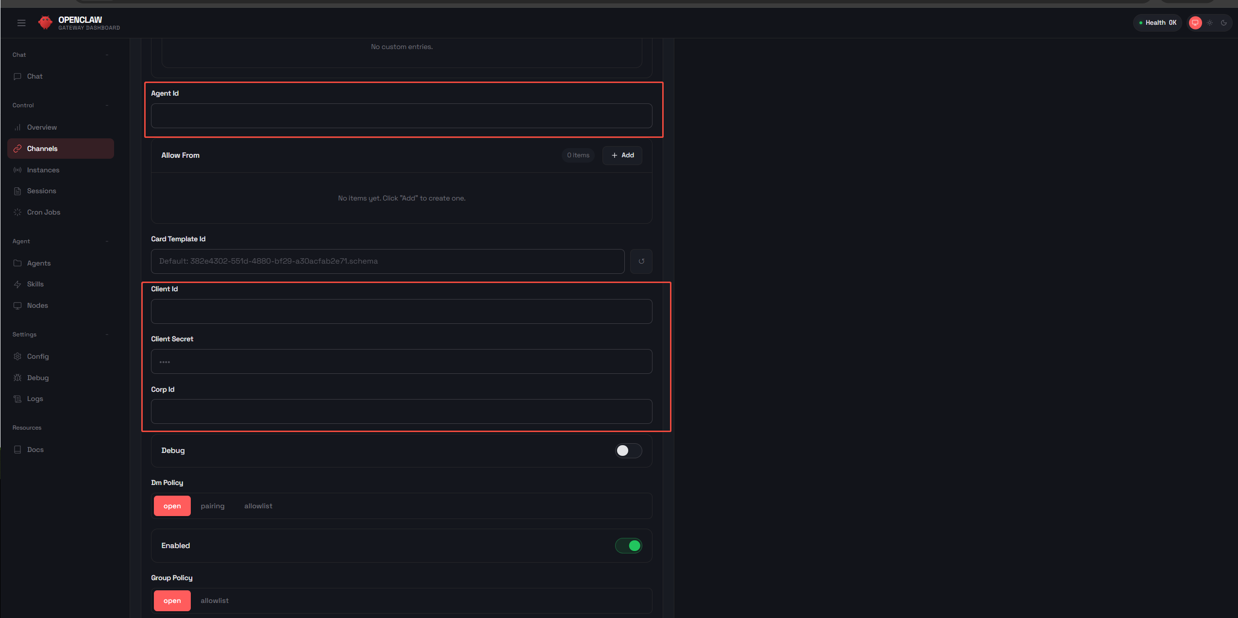 连接成功后,点击左侧菜单的【Channels】菜单,在Ding Talk中分别配置在钉钉获取的信息,其中agentid / Robot Code对应钉钉平台App ID、Clientid对应钉钉平台Clientid、Clientsecet对应钉钉平台Client Secret、Corpid对应钉钉平台企业ID。说明:本文档适用于26.2.3及以上版本。