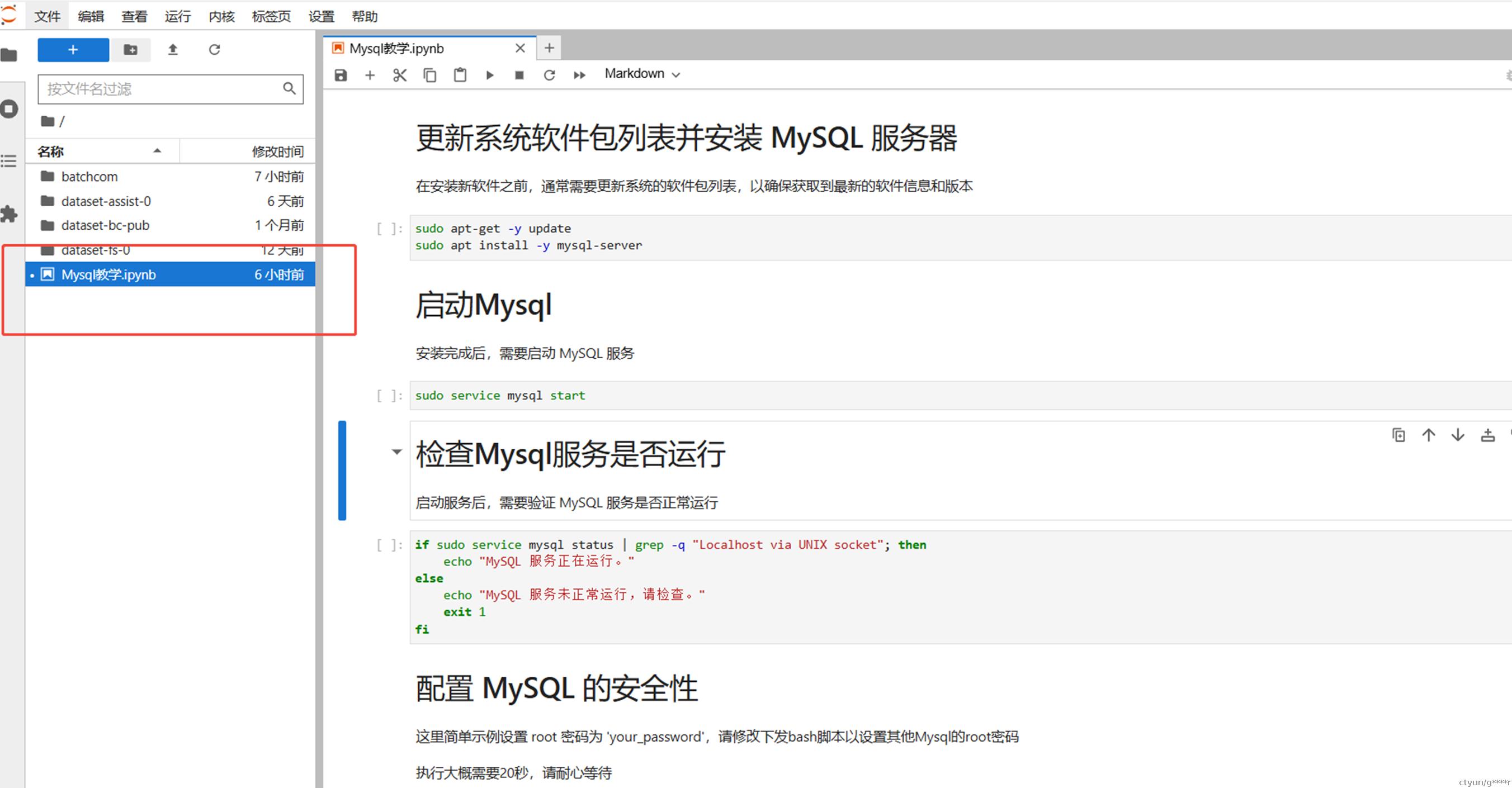 步骤2:点击【打开】跳转到开发机,在Jupyter主页面中默认打开了教学与实践的内容,双击左侧已内置的notebook【Mysql教学.ipynb】打开:
