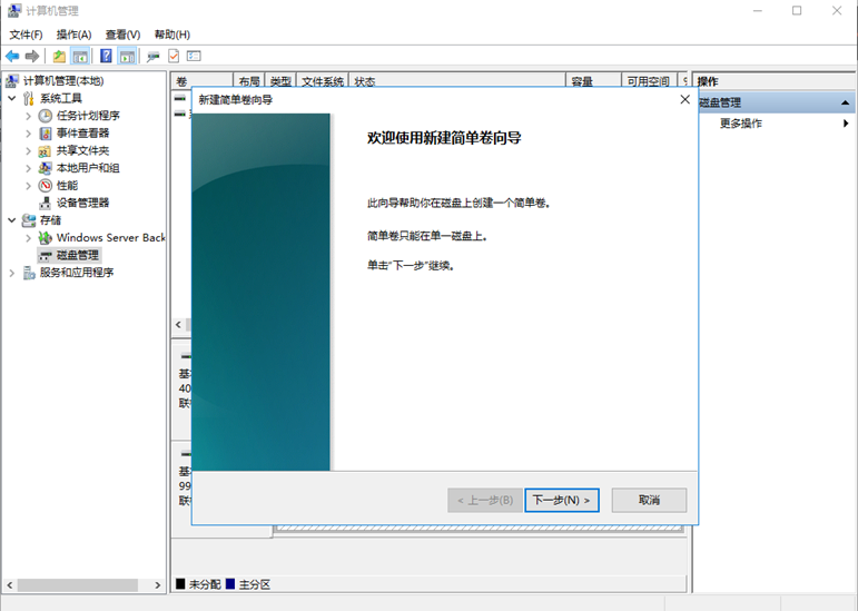 步骤 6 在磁盘1右侧的未分配的区域,右键单击选择“新建简单卷”。
