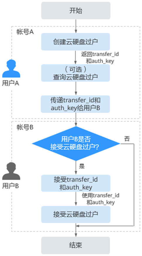 以将帐号A的云硬盘过户给帐号B为例。用户A属于帐号A,用户B属于帐号B。由用户A创建过户记录,用户B通过云硬盘过户记录ID(transfer_id)和云硬盘过户的身份认证密钥(auth_key)接受过户,接受成功后即完成过户,基本流程如下图所示。