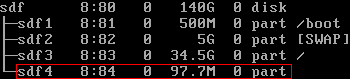 系统卷大小已经从40GiB扩展至140GiB。其中64MB大小的“sdf4”分区为存储物理机配置信息的configdriver分区。
