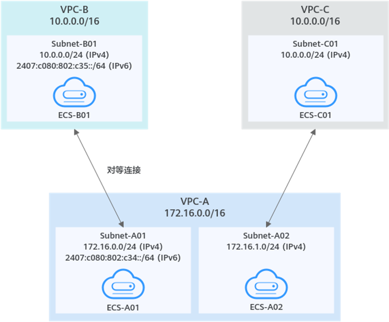 本示例中,中心VPC-A拥有两个子网,并分别关联至不同的路由表。在子网Subnet-A01和VPC-B之间创建对等连接Peering-AB,用于IPv6通信。在子网Subnet-A02和VPC-C之间创建对等连接Peering-AC,用于IPv4通信。此处VPC-B和VPC-C网段重叠,由于VPC-A的两个子网关联至不同的路由表,因此对等连接路由不会冲突。
