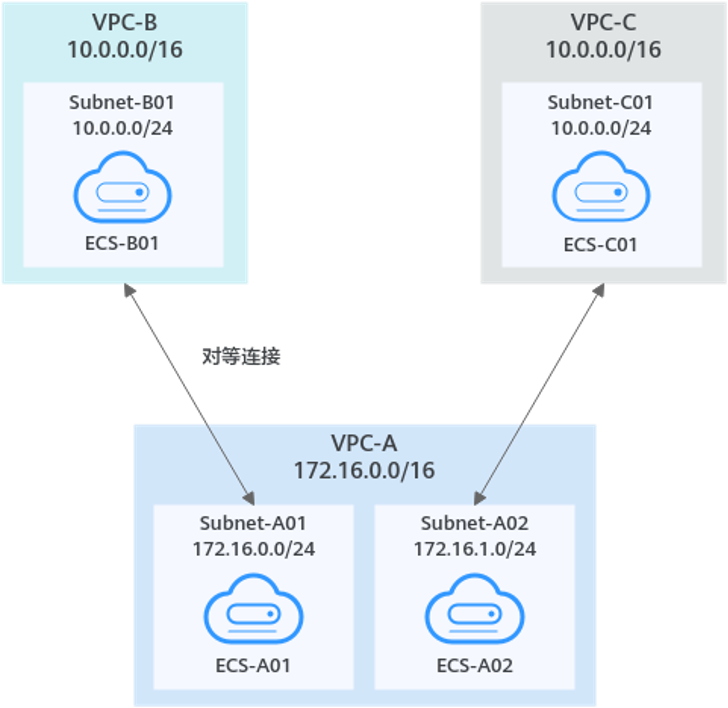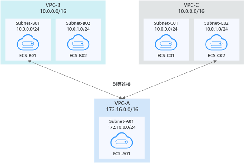本示例中,在中心VPC-A和Subnet-B01之间创建对等连接Peering-AB,在中心VPC-A和Subnet-C02之间创建对等连接Peering-AC。此处VPC-B和VPC-C的VPC网段重叠,但是Subnet-B01和Subnet-C02子网网段不重叠,不会造成路由冲突。