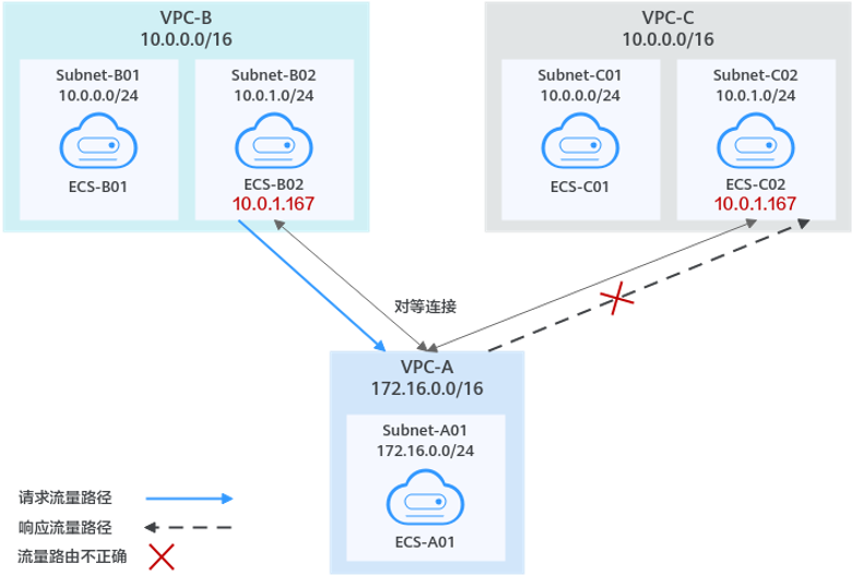此时VPC-C的子网Subnet-C02中存在云服务器ECS-C02,与ECS-B02私有IP地址相同,均为10.0.1.167/32,则响应流量最终错误的返回到ECS-C02,ECS-B02无法收到响应流量。