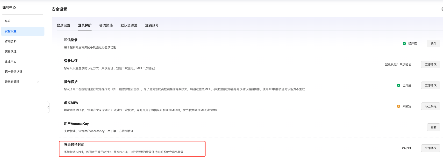 为了安全着想,官网页面默认3小时无操作情况下会自动退出,可在“账号中心>安全设置>登录保持时间”修改时长。
