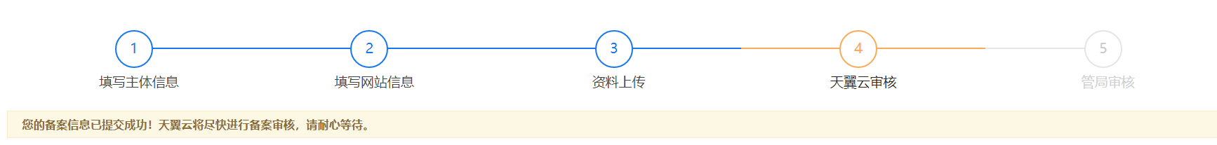 提交预审核,天翼云备案专员将会尽快审核您的信息是否符合备案要求。审核符合要求的,天翼云会尽快代您将备案信息提交至管局进行备案终审,提交管局后,请主体和网站负责人收到验证短信后,在24小时内按照短信指引完成,否则会被管局退单。