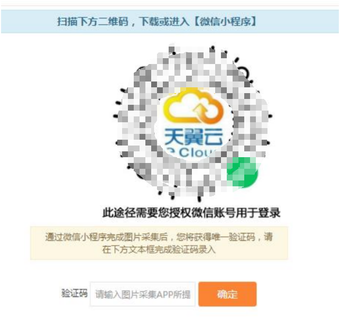 通过微信小程序扫描二维码后,在小程序端按照系统所提示采集需要图片,完成图片采集完成后会自动生成18位验证码,需将验证码填报至上图指定位置后,点击“确定”按钮,系统会自动将图片对应到合适位置。