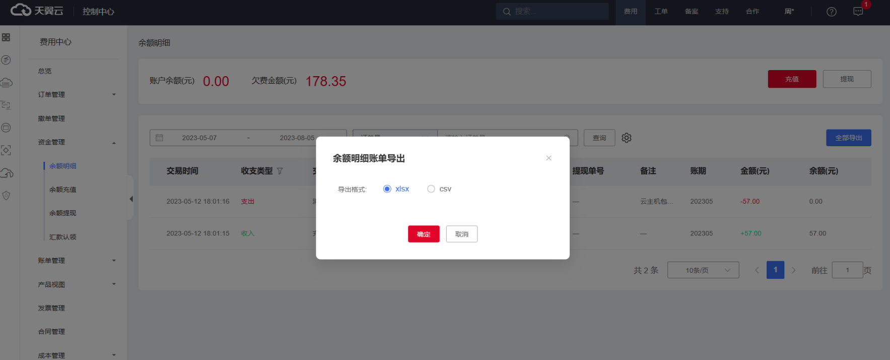 1、登录天翼云官网,点击“管理中心”进入“费用中心”页面后,点击“资金管理>余额明细”,进入“余额明细”页面;