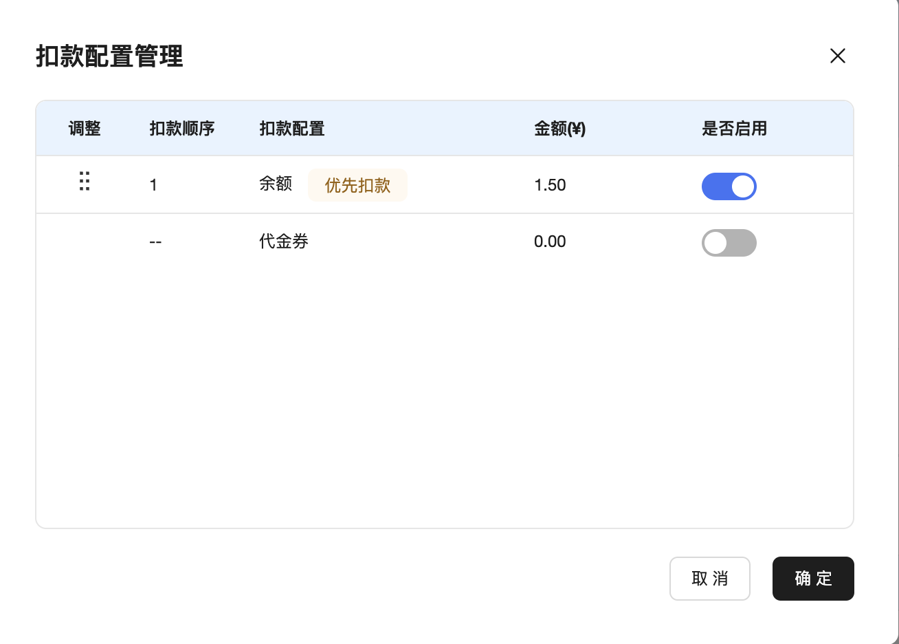 - 若同时开启余额、代金券的扣款设置,系统将按扣款顺序选择大于待扣款金额的一种支付方式,从该支付方式进行全额扣款。若两种支付方式的额度均小于待扣款金额,则扣款失败。