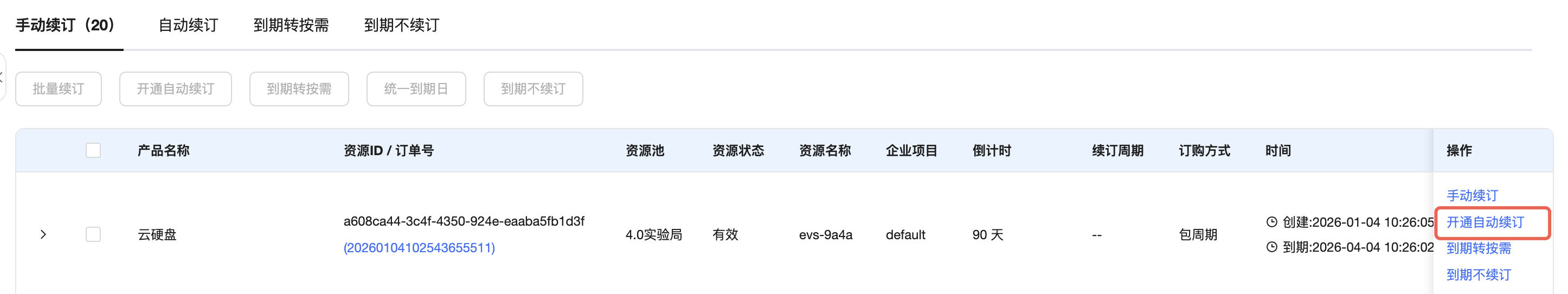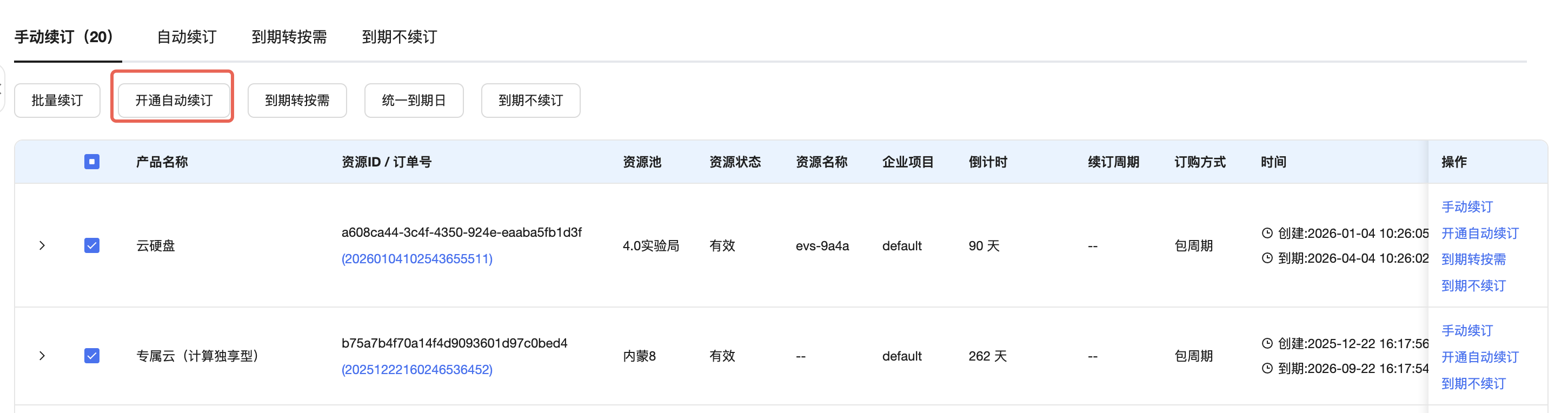 单个自动续订:在资源页面找到待续订的资源,单击操作列的“开通自动续订”。