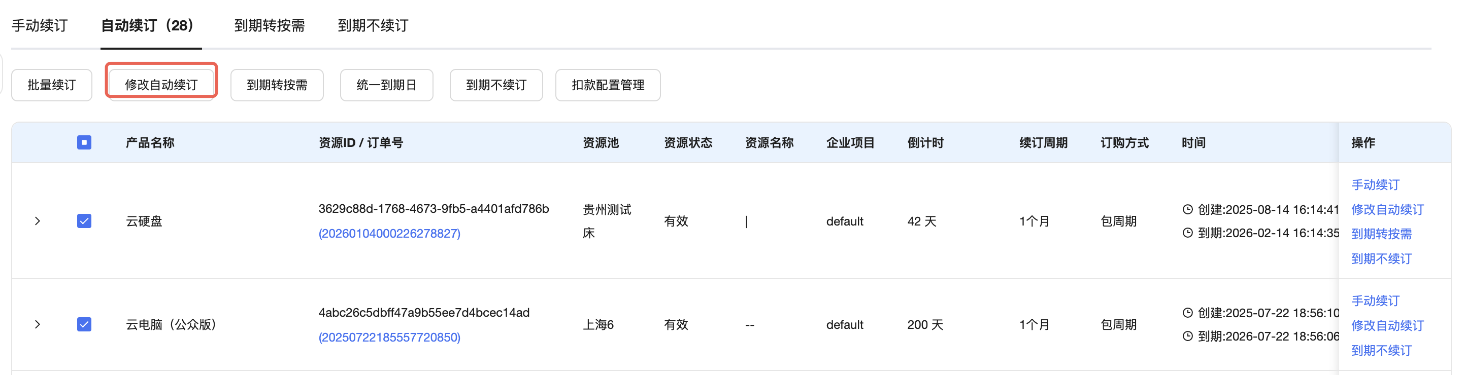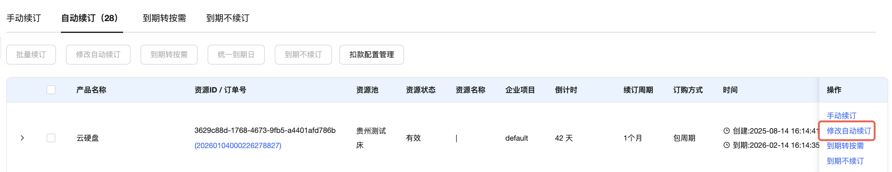 步骤2 在资源页面找到待修改自动续订的资源,单击操作列的“修改自动续订”。