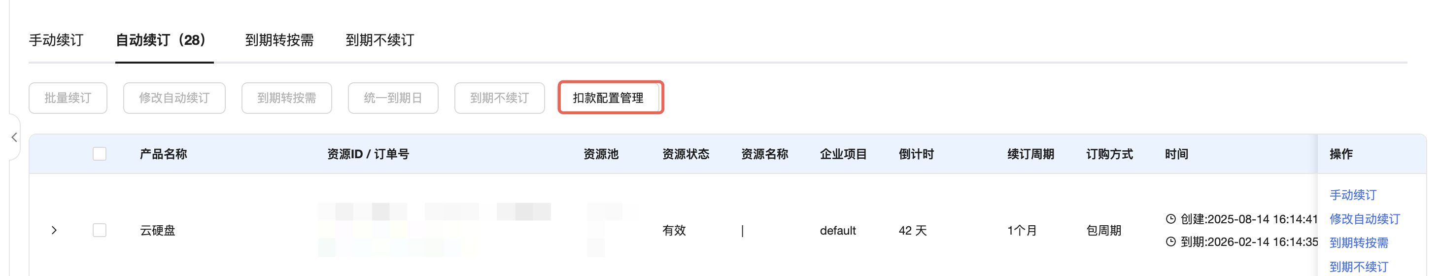支付方式及支付时间:将在资源到期前10天或前7天进行自动续订下单及扣费。