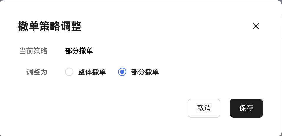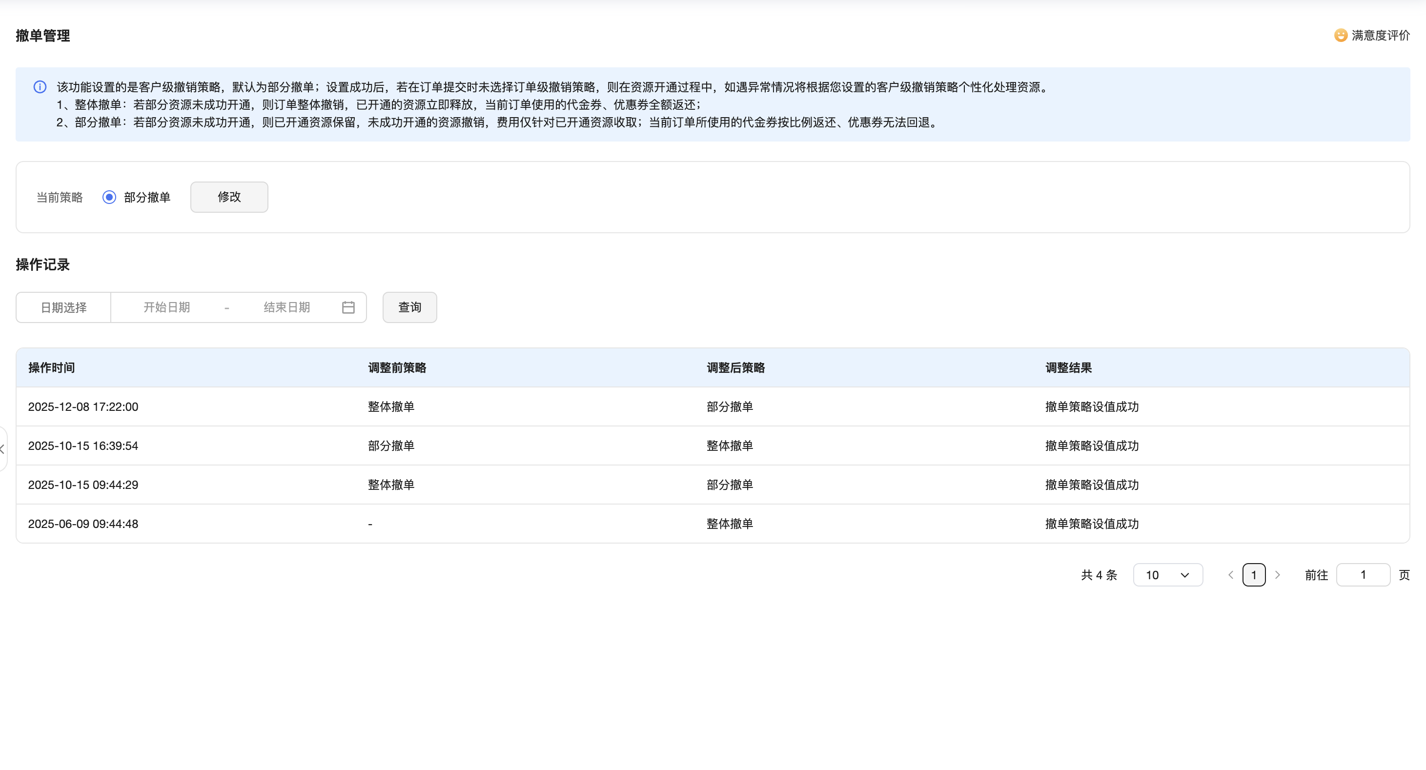 该功能设置的是客户级撤销策略,默认为部分撤单;设置成功后,若在订单提交时未选择订单级撤销策略,则在资源开通过程中,如遇异常情况将根据您设置的客户级撤销策略个性化处理资源。