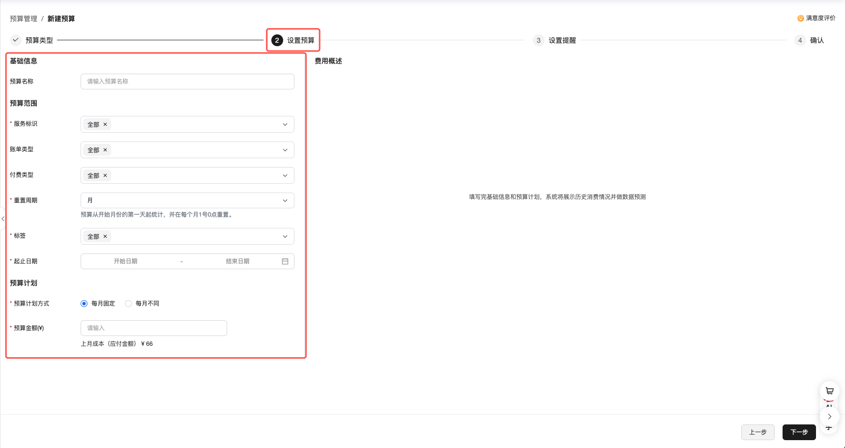 重置周期:可选月、季、年。预算从开始月份的第一天起统计,并在每个月1号0点重置。