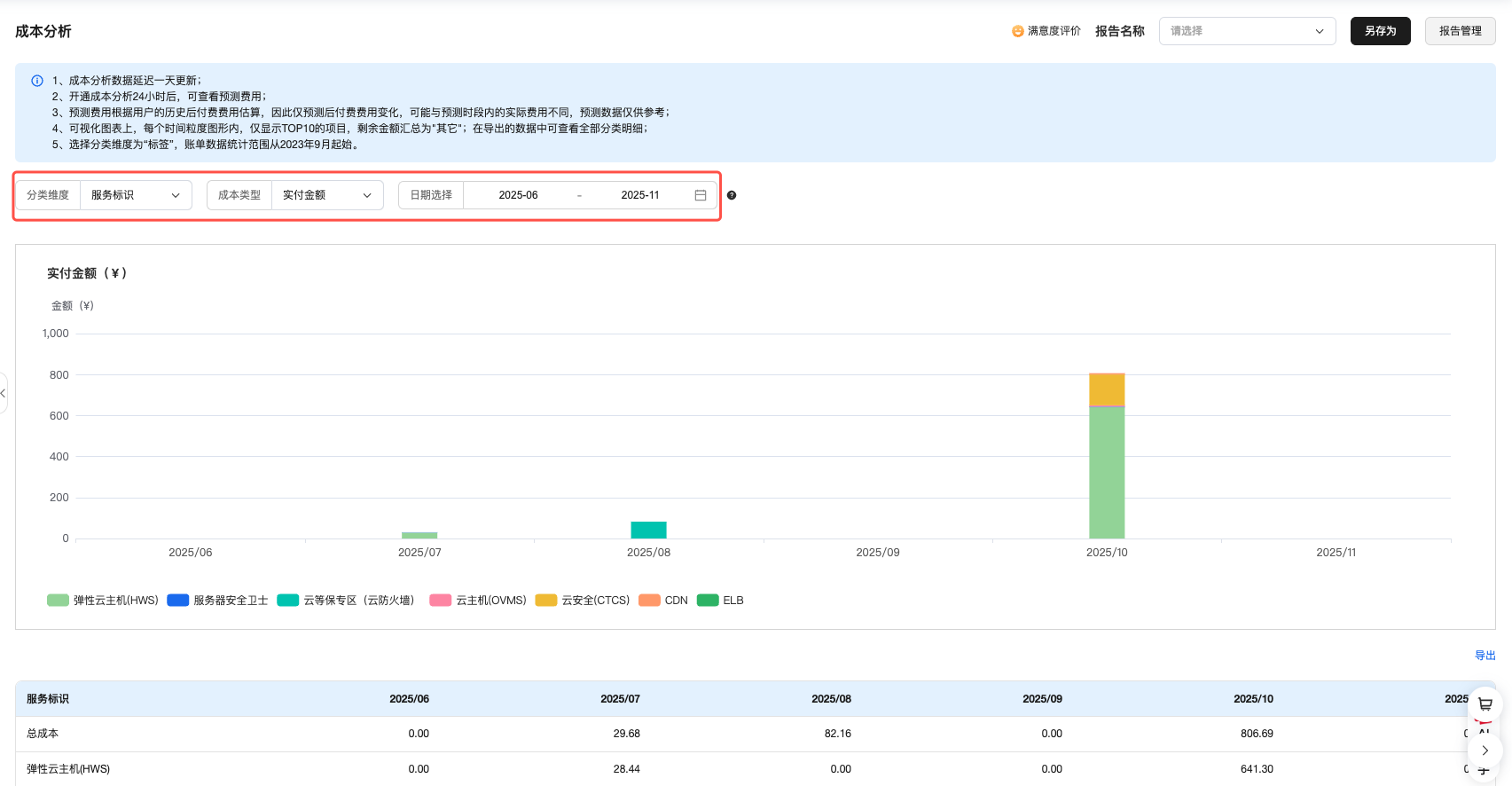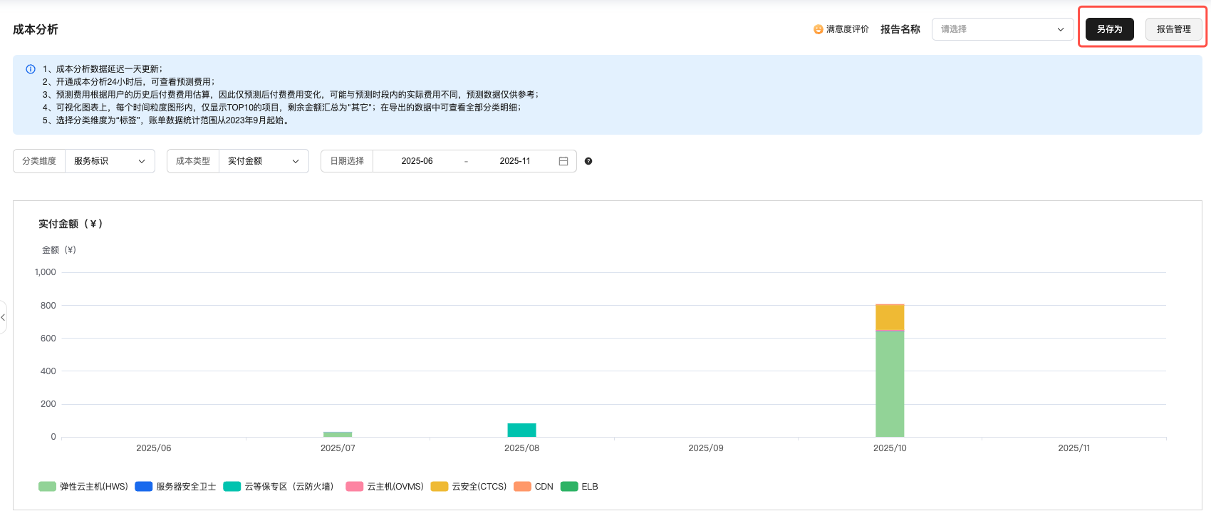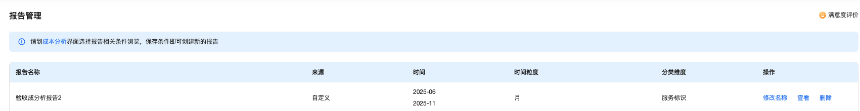 支持成本分析报告保存。保存的报告可以在报告管理查看。