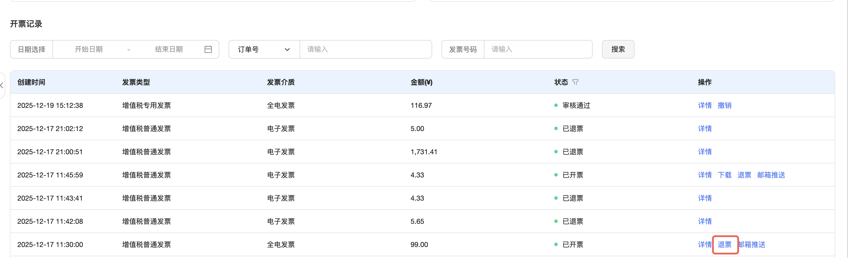 2.在开票记录找到对应的发票,操作列点击“退票”按钮。