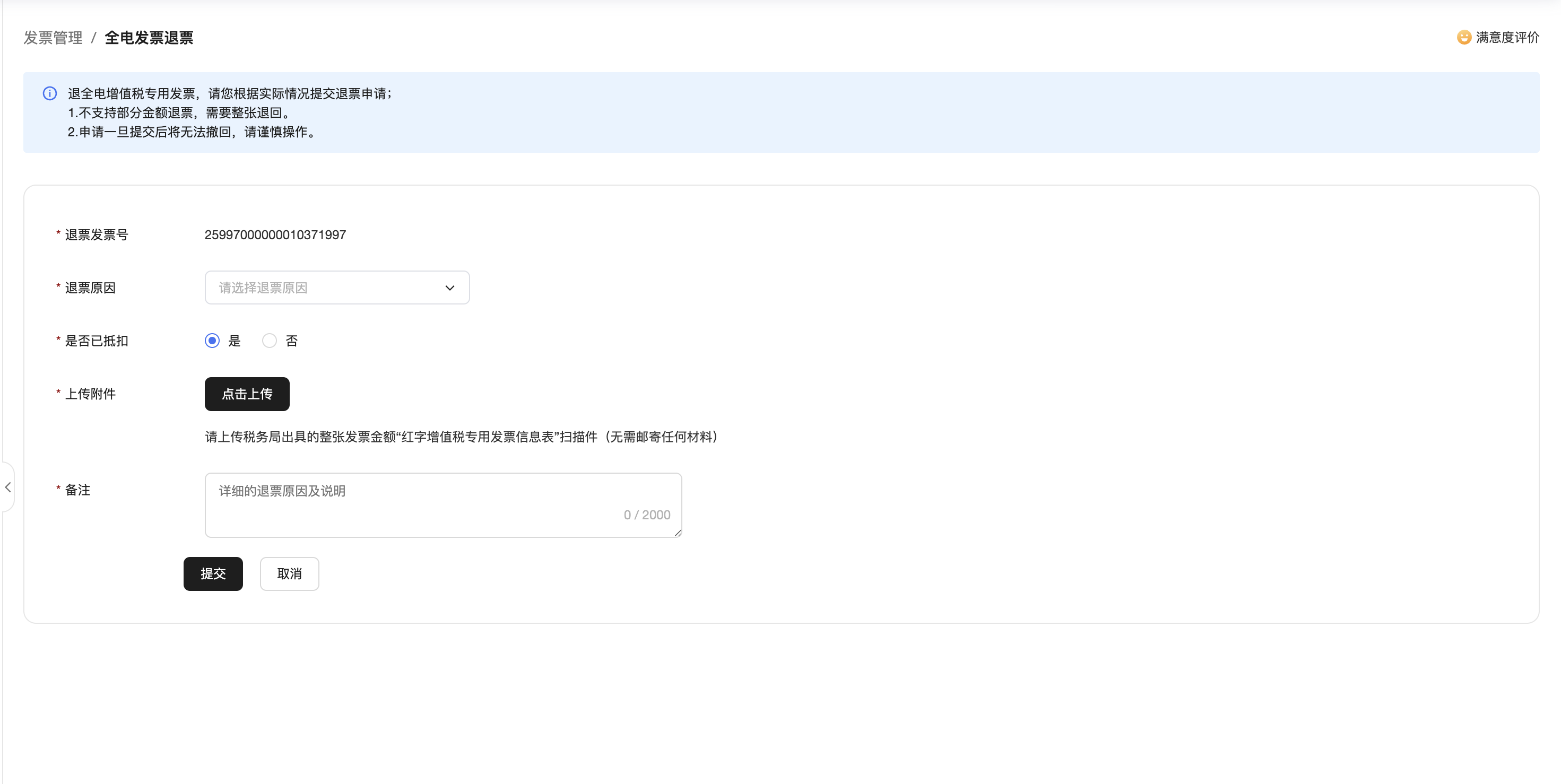3.选择退票原因,选择是否已抵扣,如果已抵扣请上传税务局出具的整张发票金额“红字增值税专用发票信息表”扫描件,填写备注