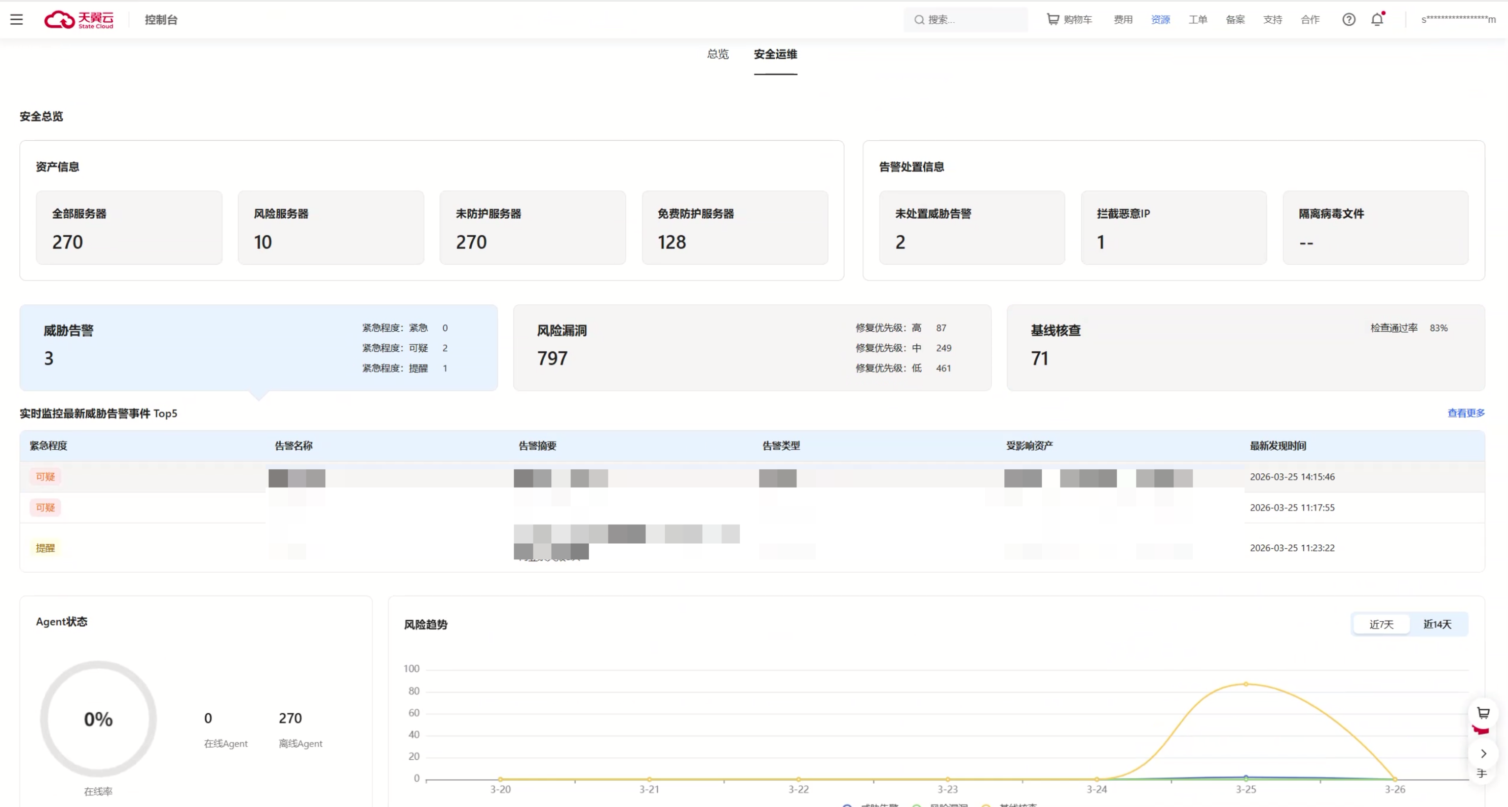 安全运维提供查看和管理云服务安全基本数据,您可以通过界面总览信息快速查看和管理您的资源的安全情况。