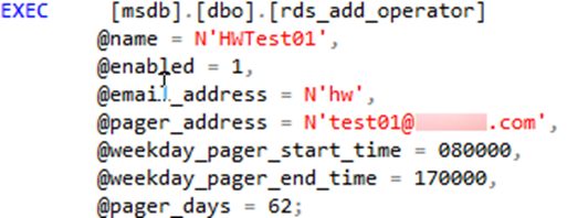 | saturday_pager_start_time | SQLServerAgent服务在星期六向指定操作员发送寻呼通知的时间。 “saturday_pager_start_time”的值为“int”,默认值为090000,指示9:00 A.M。 并且必须使用HHMMSS格式输入。 |