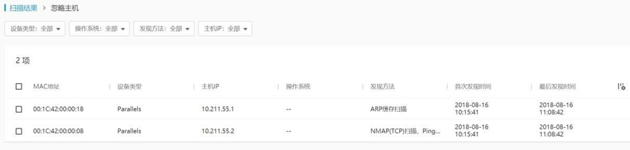 忽略主机列表指的是在发现主机列表中手动忽略掉的主机。勾选要忽略的主机,点击“忽略主机”按钮即可添加到忽略主机列表中。