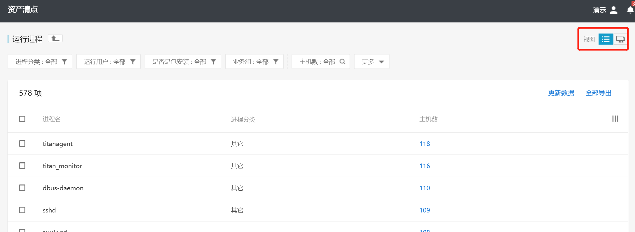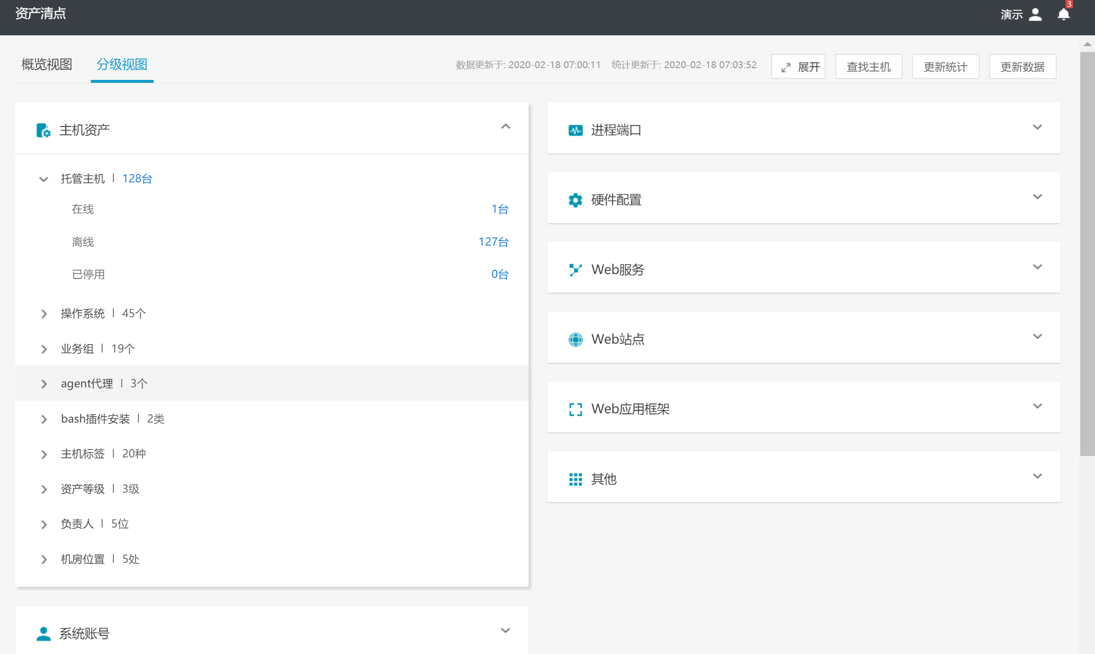 所有主机中的资产信息,每天自动更新一次,如果想获取最新信息,可以点击右上角的”更新数据”按钮,手动触发更新;对于功能中的统计数据,也可以手动触发”更新统计”。