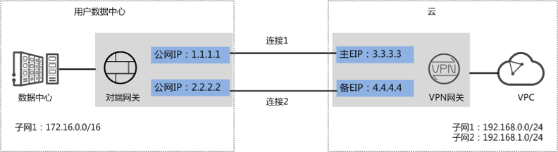 本示例中,用户数据中心和VPC之间采用两条VPN连接保证网络可靠性,连接1和连接2互为主备。当其中一条VPN连接故障时,系统可以自动切换到另一条VPN连接,保证网络不中断。