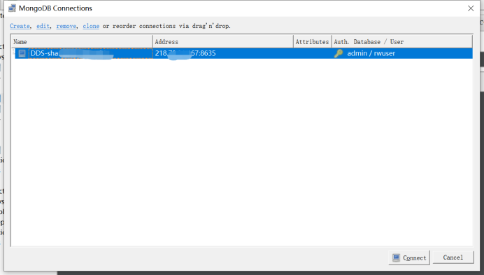 a.在“Connection”页签,“Name”填写新建连接的名称,“Address”填写DDS实例绑定的弹性IP和实例的数据库端口。