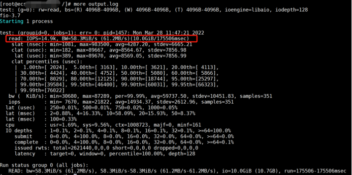 其中,“/mnt/sfs_turbo/test_fio”为待测试的目标文件的挂载路径,需具体到文件名,即这里要测试的是“/mnt/sfs_turbo”目录下的“test_fio”文件,请根据实际填写。