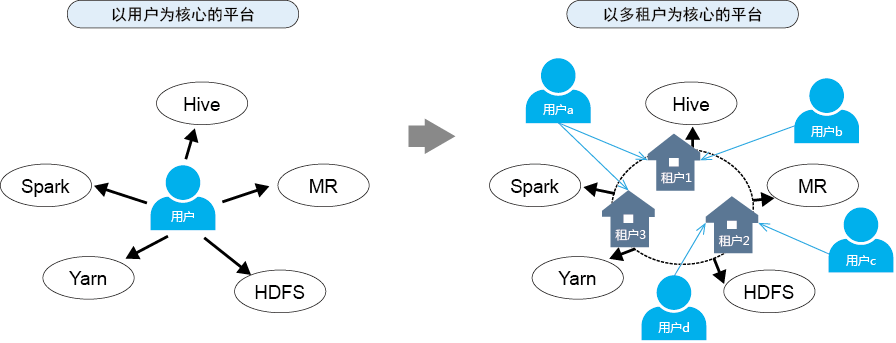 租户是FusionInsight大数据平台的核心概念,使传统的以用户为核心的大数据平台向以多租户为核心的大数据平台转变,更好的适应现代企业多租户应用环境,如下图所示。