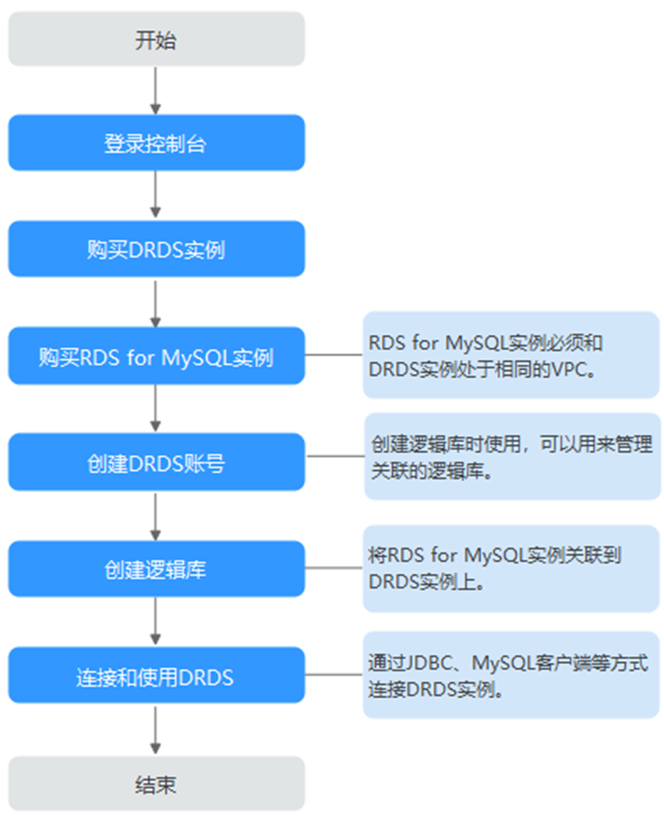 本章以DRDS实例如何关联数据节点(RDS for MySQL实例)为例介绍DRDS的使用流程。