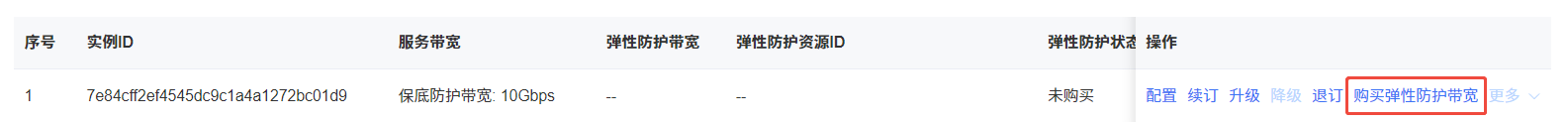 在DDoS高防IP实例列表页面,找到目标实例,单击操作列的“购买弹性防护带宽”。