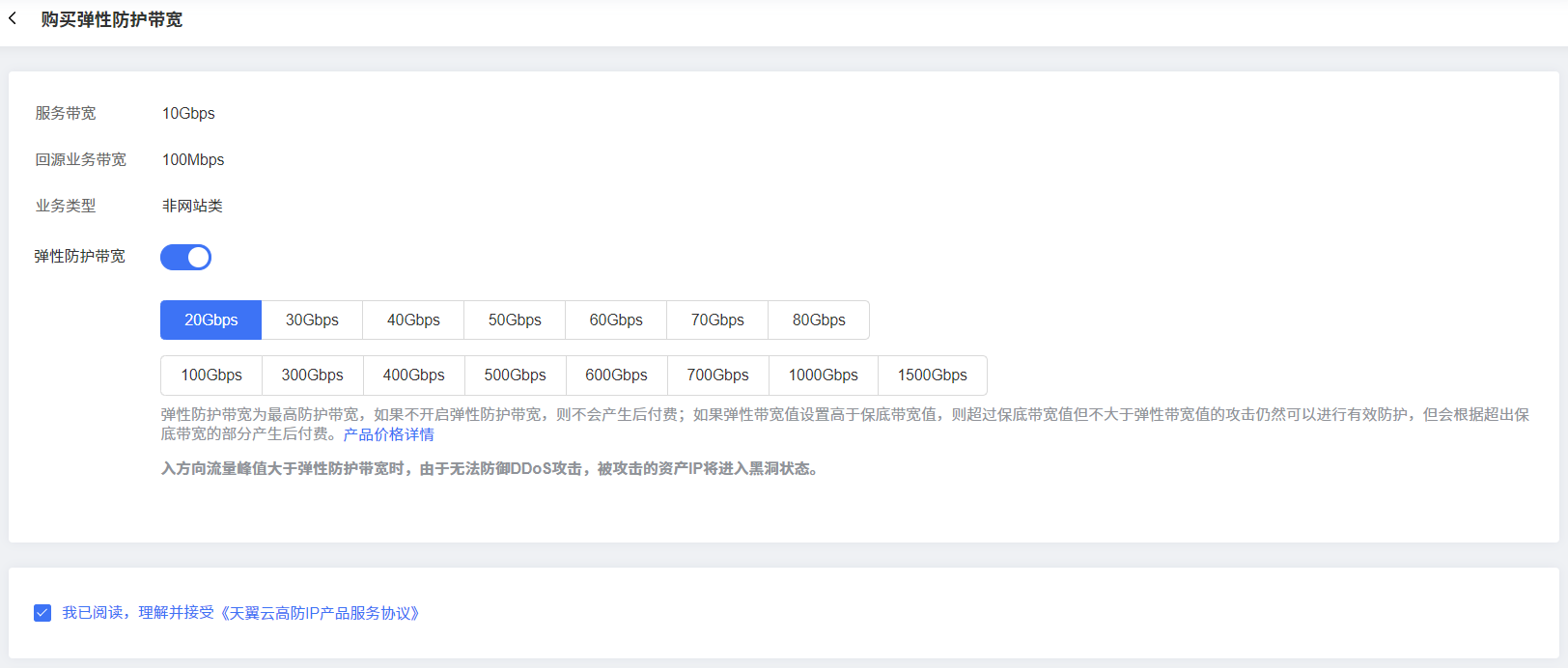 勾选“我已阅读,理解并接受《天翼云高防IP产品服务协议》”,单击“立即订购”。