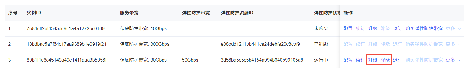 在DDoS高防IP实例列表页面,找到目标实例,单击操作列的“更多”,根据实际情况选择“升级弹性防护带宽”或“降级弹性防护带宽”。