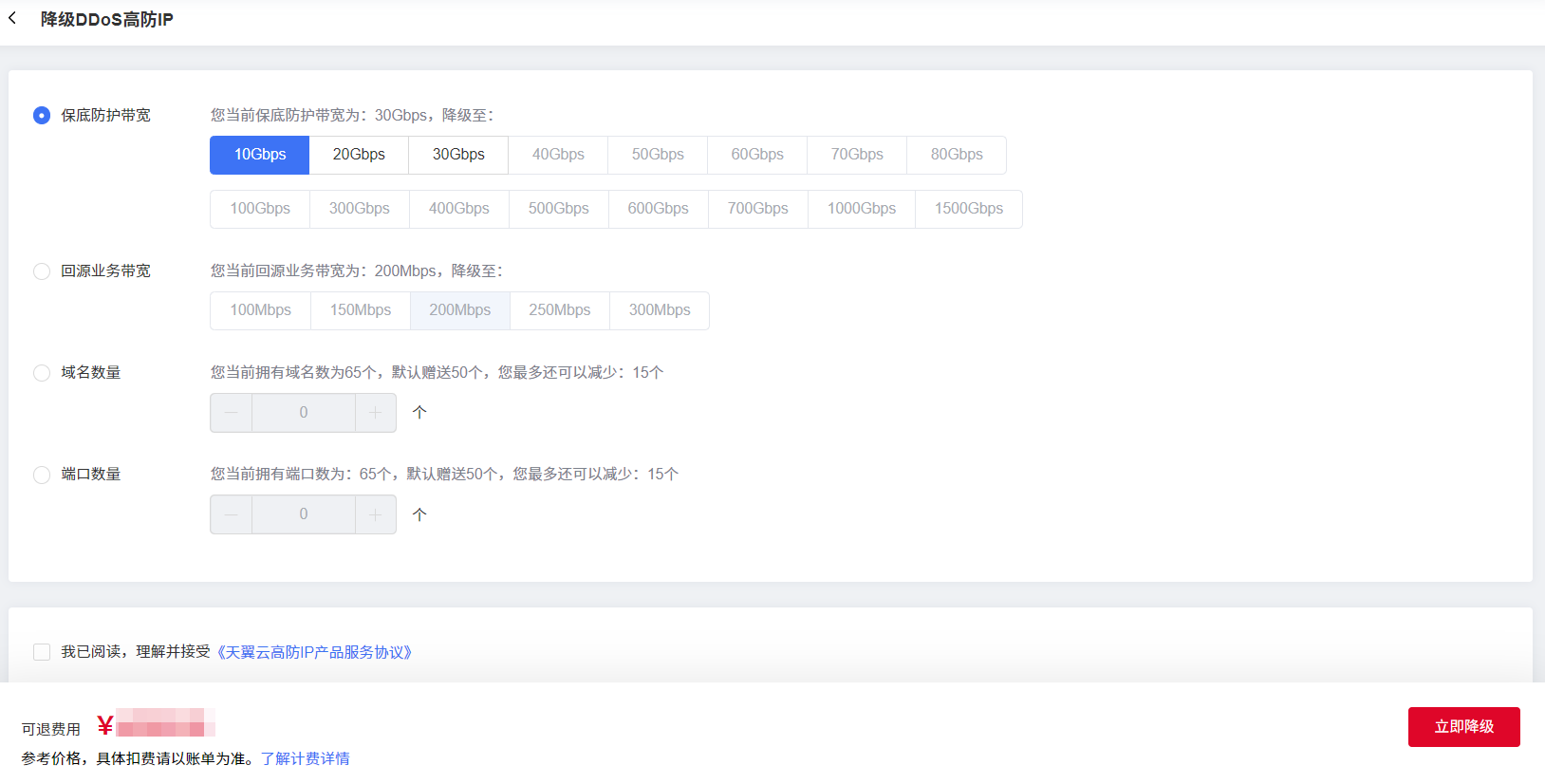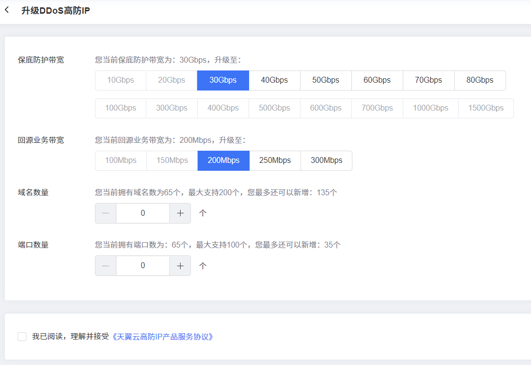 勾选“我已阅读,理解并接受《天翼云高防IP产品服务协议》”,单击“立即升级”或“立即降级”。