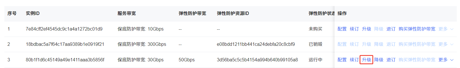 在DDoS高防IP实例列表页面,找到目标实例,单击操作列的“升级”。
