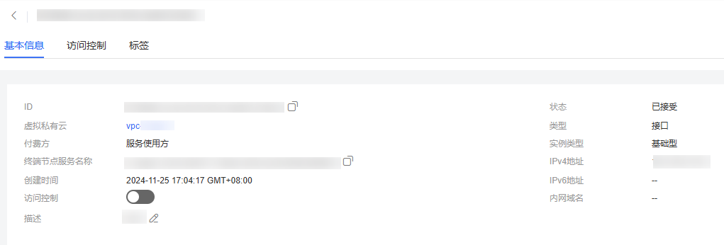 单击终端节点ID,即可查看终端节点的详细信息。接口终端节点创建成功后,会生成一个“节点IP”(就是私有IP)和“内网域名”(如果在创建终端节点时您勾选了“内网域名”)。