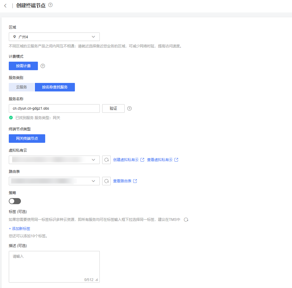 虚拟私有云 选择终端节点所属的虚拟私有云。 路由表 当创建连接“网关”类型终端节点服务的终端节点时,则会出现该参数。