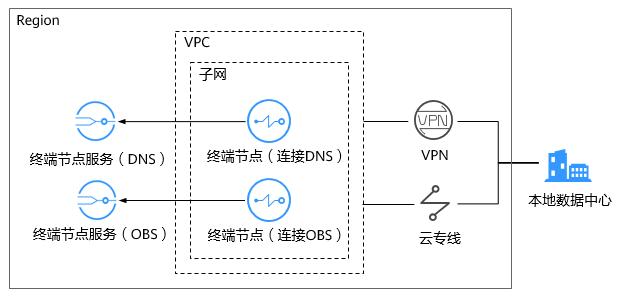 如图所示,线下节点(即本地数据中心)通过VPN或者云专线与VPC连通。在VPC内创建终端节点,与云上的OBS和DNS类型的终端节点服务连接,实现线下节点(即本地数据中心)通过内网访问云上服务。