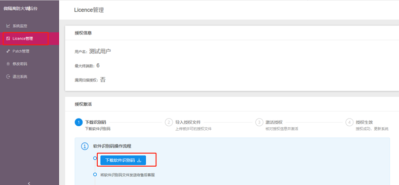 点击左侧导航栏的【License管理】,在授权激活页面点击下载软件识别码。