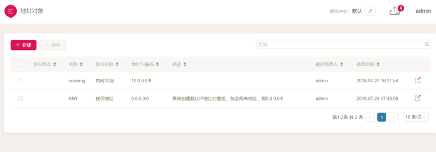 2.地址对象页面可以对地址对象进行新建、删除、修改操作。