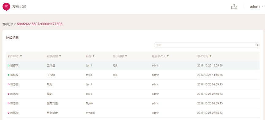 点击每条发布记录最右侧的 ,即可进入比较页面,本页面会显示本条发布记录时与现有策略的差别项。