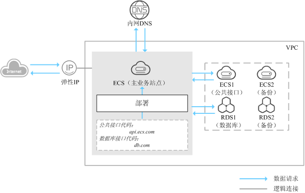当该网站在运行过程中,因ECS1故障,需要将业务切换到备份的云主机ECS2时,若云主机没有配置内网域名,则需要通过修改主业务节点ECS的代码来重新设置云主机的内网IP地址。该操作需要中断业务并重新发布网站,耗时耗力。