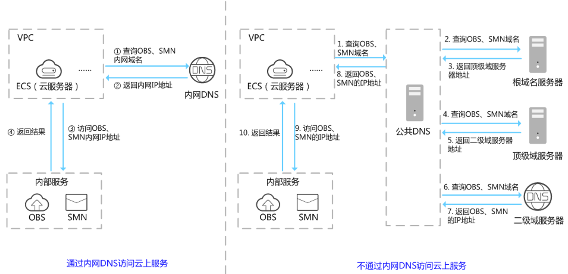 当云主机访问OBS、SMN等云上服务时,内网DNS直接返回这些云服务的内网地址,无需通过Internet,访问时延小,性能高,解析过程如下图左侧的“1~4”所示。