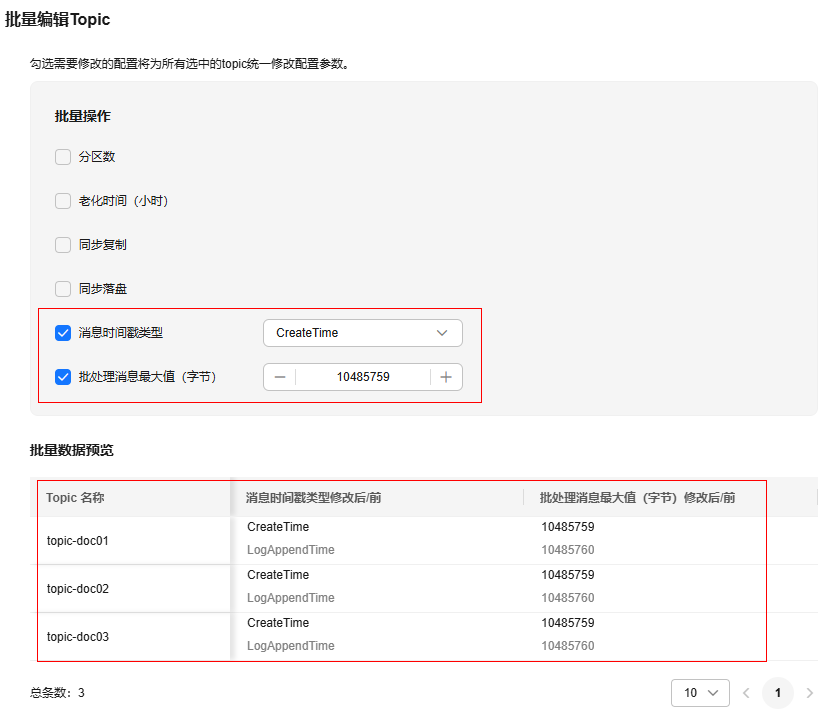 批量修改Topic配置时,每次最多修改100个Topic的配置。