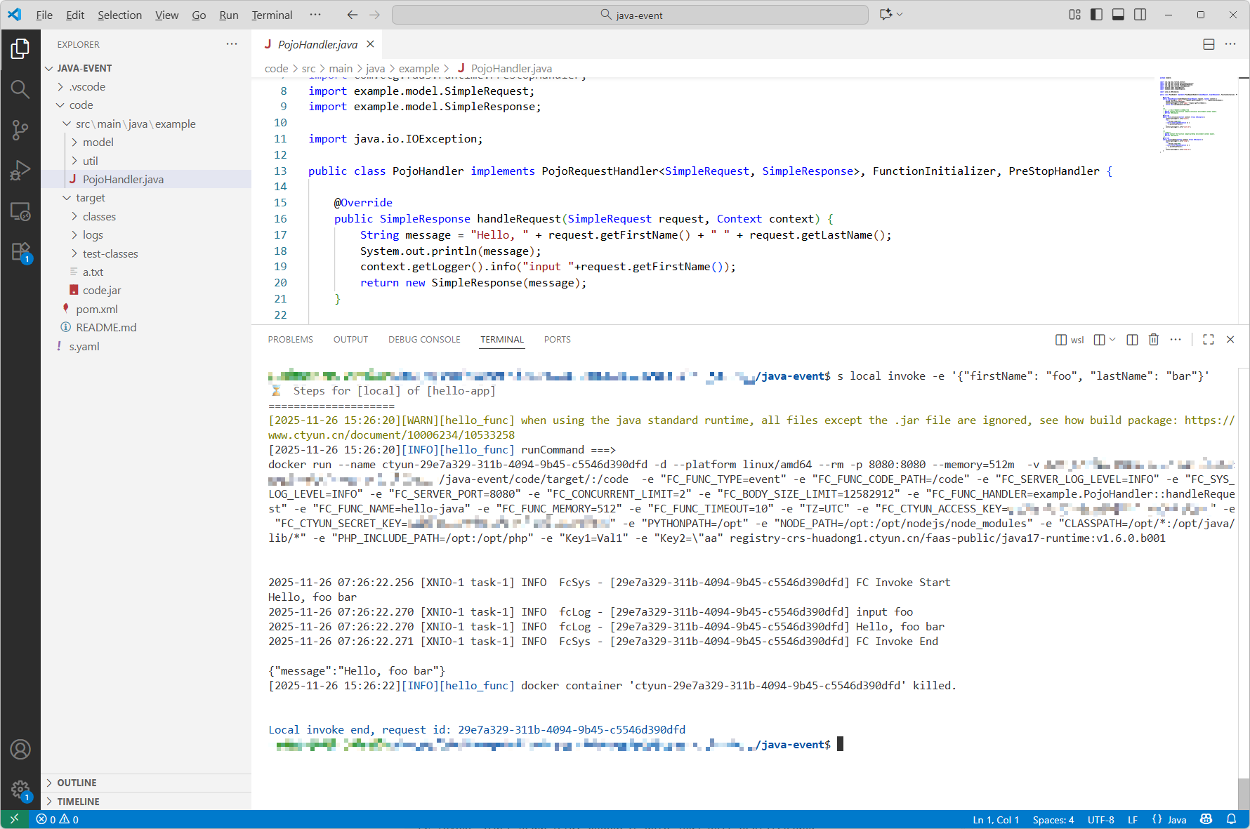 local debug 命令启动本地函数容器并阻塞,待完成一次调试执行后容器退出。