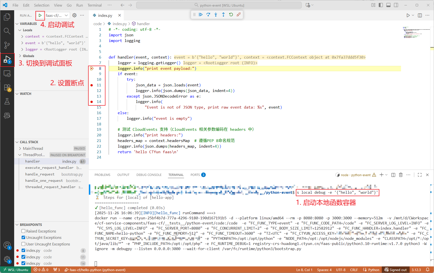 s local debug启动本地函数容器。在需要调试的代码行号设置调试断点。