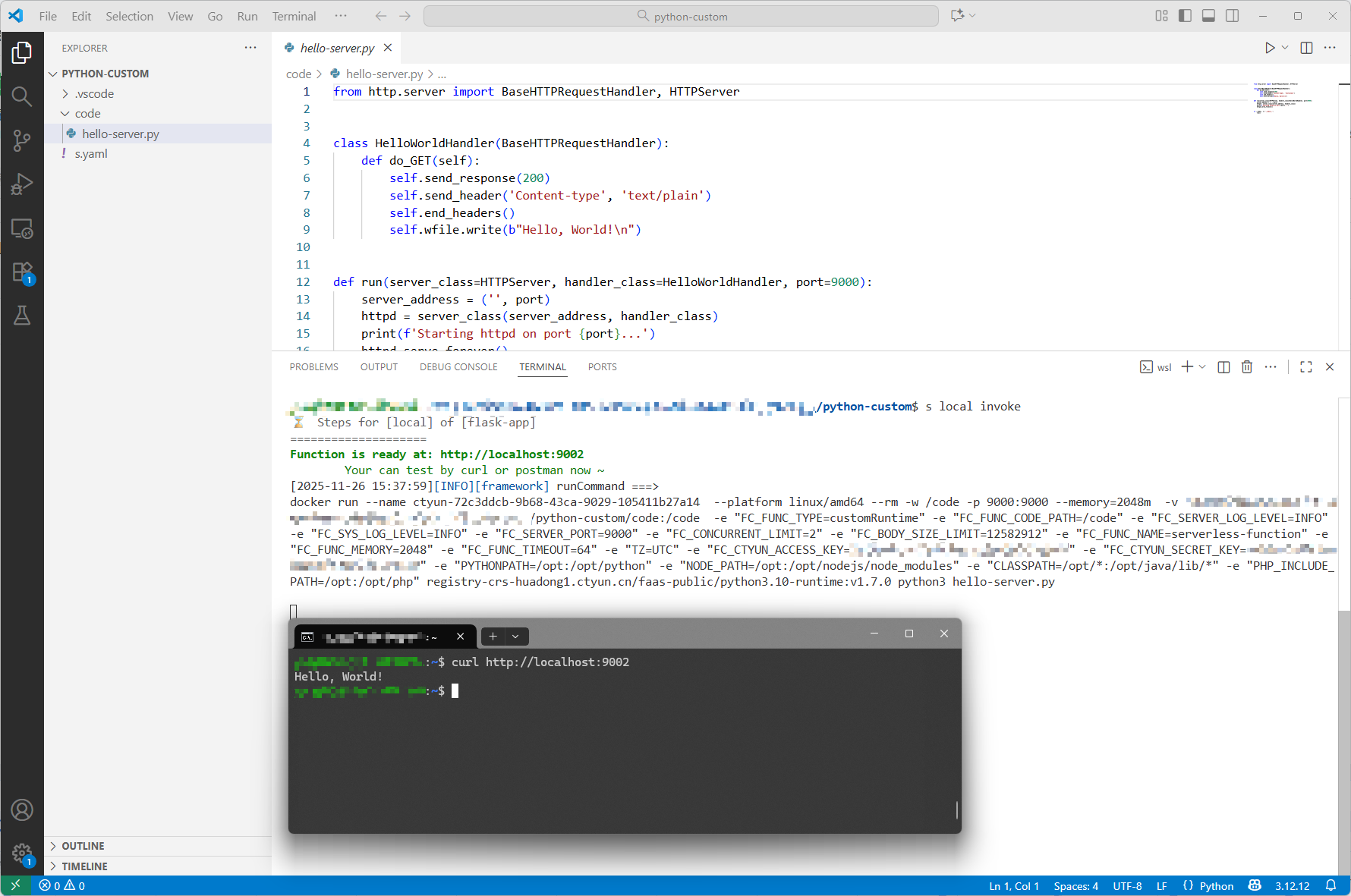 对于 自定义运行时函数,local invoke 命令启动本地函数容器并监听指定端口,随后阻塞等待请求,您可以通过 Ctrl + C 中断命令。