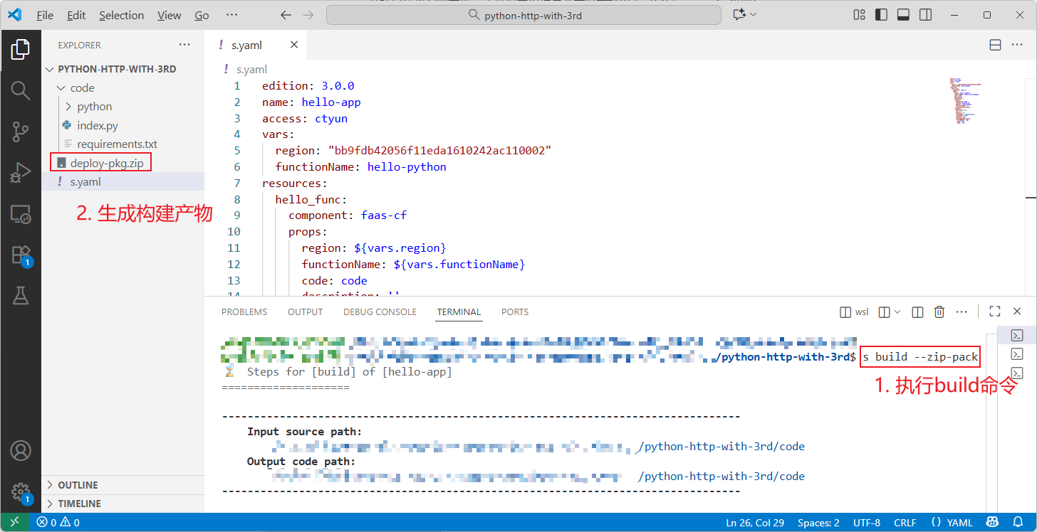 以Python项目为例,进入到资源描述文件(s.yaml)所在的路径,然后执行 s build --zip-pack 命令编译并打包产物: